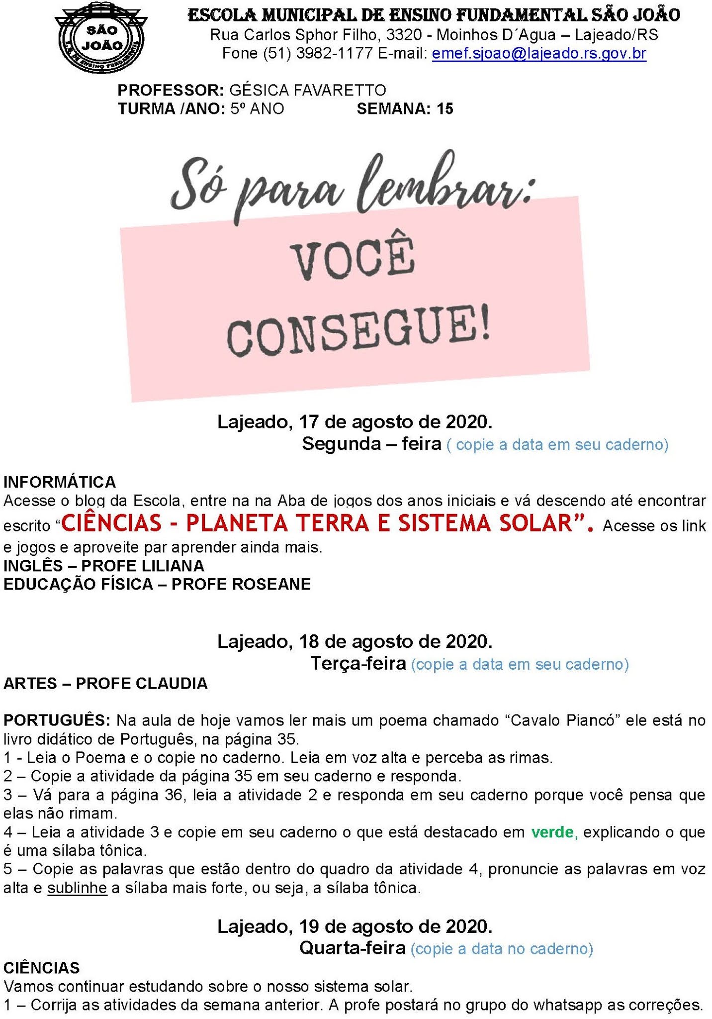 Olá, Famílias! Neste momento precisamos trabalhar, estudar e aprender de forma distante fisicamente mas com o mesmo empenho e carinho. Os alunos do 5° Ano levaram diversas atividades impressas e também um bilhete com as páginas dos livros didáticos a serem realizadas no caderno durante a semana passada e está.