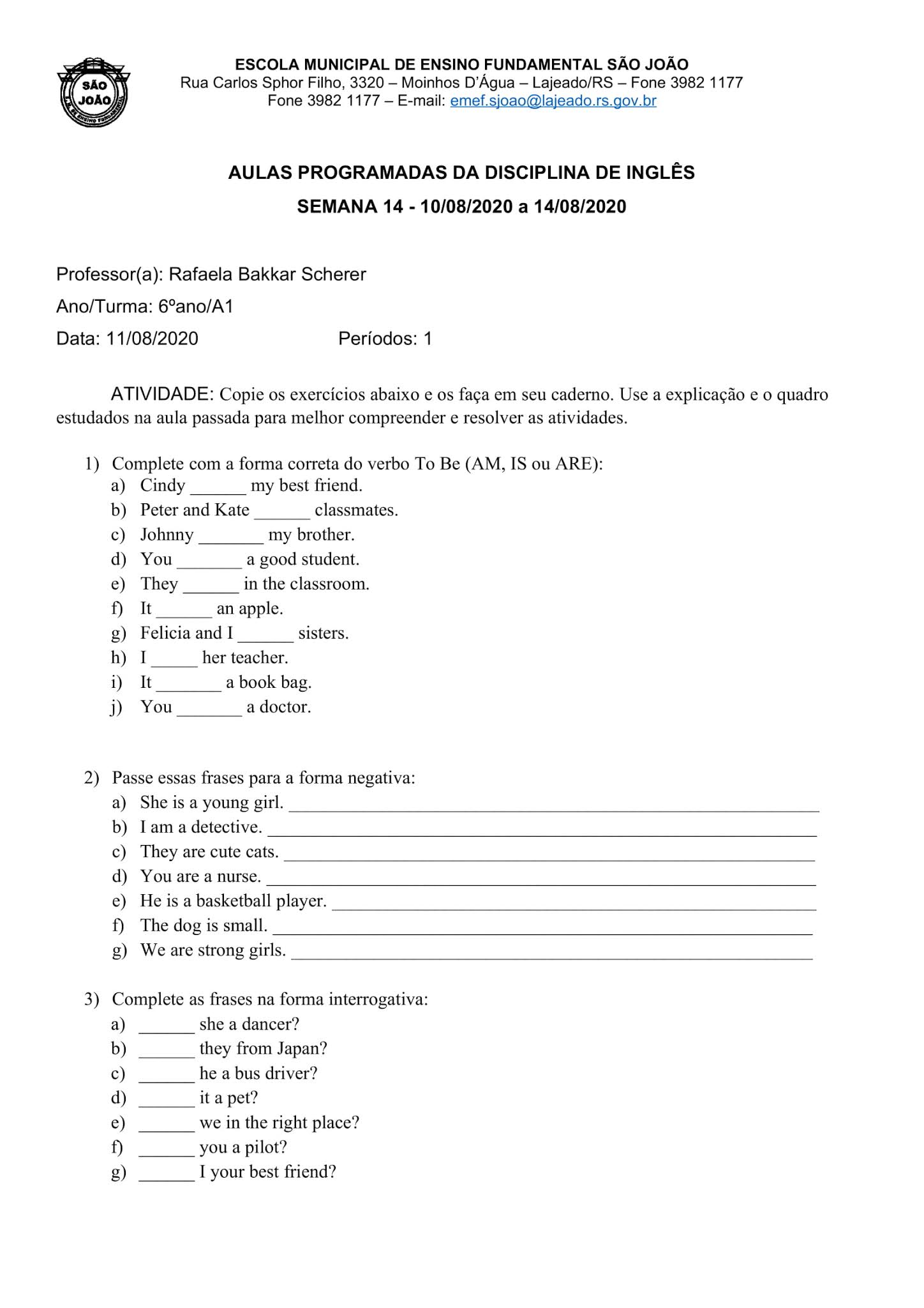 *ATIVIDADES a serem realizadas numa folha de bloco, com identificação completa e DATA da realização, folha esta que será entregue na volta das AULAS PRESENCIAIS.